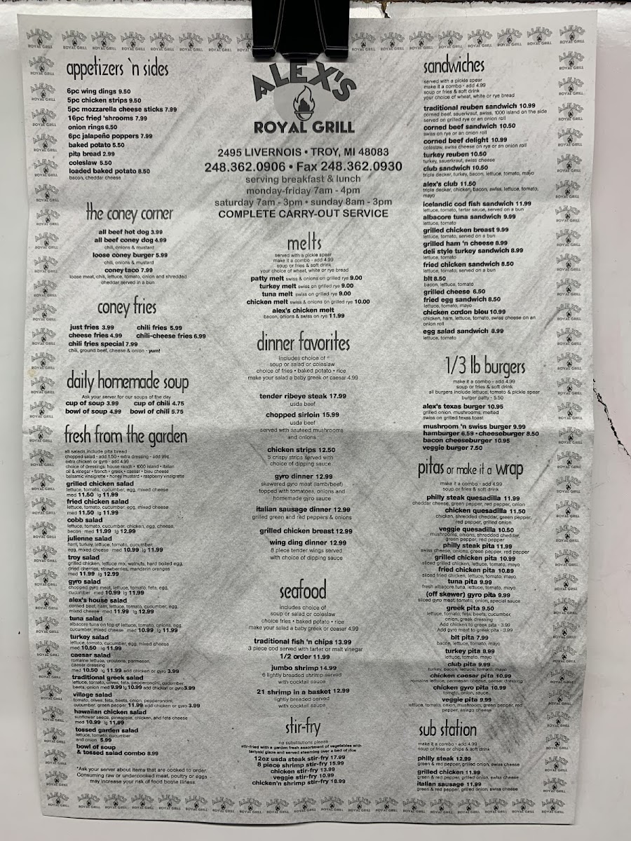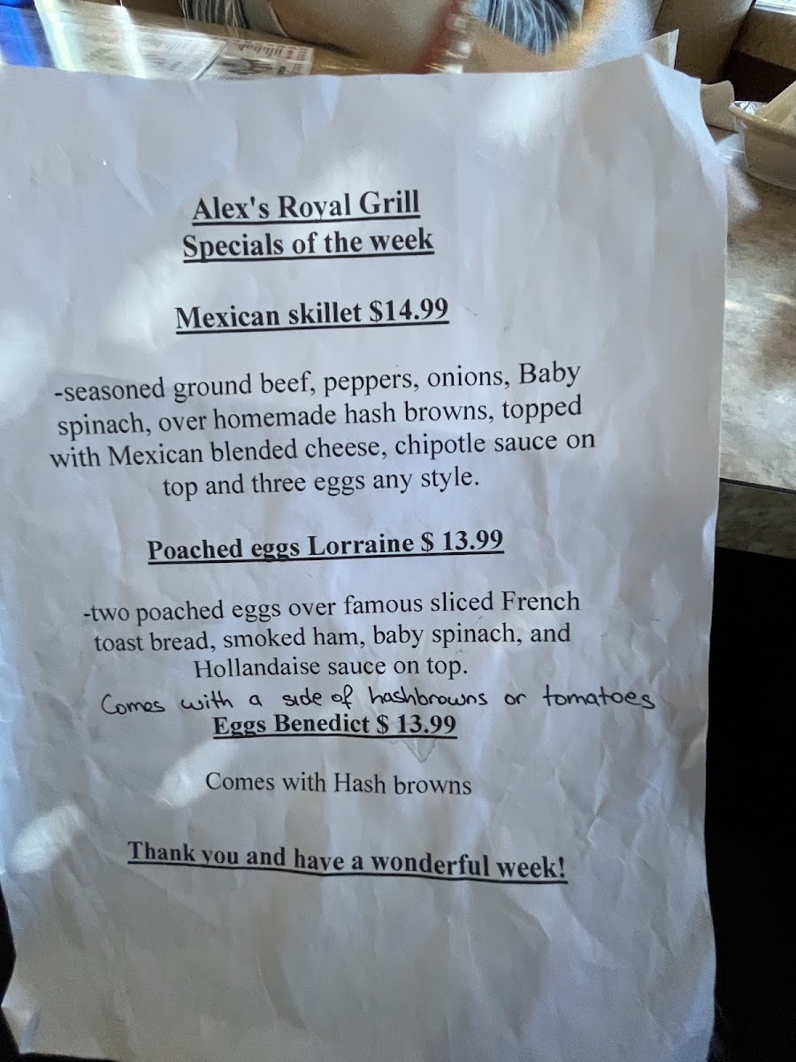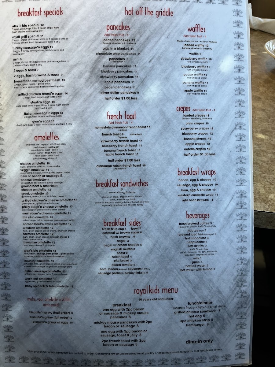 Alex's Royal Grill Menu